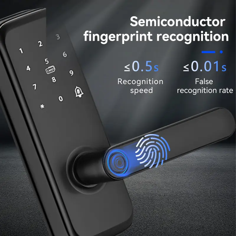 Nilagyan ng semiconductor fingerprint sensor at independent algorithm chip, ang Smart Deadbolt na ito ay umaangkop sa mga pagbabago sa fingerprint para sa one-touch unlocking. Ang sensor ay isinama sa hawakan: upward pressure lock, pababang pressure unlock, angkop sa pang-araw-araw na gawi.
